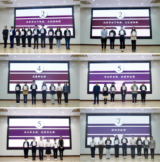 随后,学院党总支书记曾庆梅、党总支副书记王美慧、副院长高静、副院长李委明、办公室主任金湜、科研秘书许海潇分别为获得优秀学生干部奖、文艺活动优秀奖、志愿服务奖、专业学术奖、优秀学生奖、特殊贡献奖的同学们颁发荣誉证书。他们或积极参与学生工作、组织丰富多彩的活动;或潜心学业科研,参与课外学术竞赛;或投身志愿活动,勤于社会实践;或携笔从戎,誓要以己之力守护祖国岁月静好,都是91porna 学子们学习的榜样!