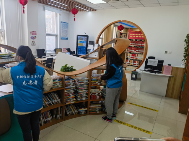 随后,“以劳养德 书韵留香”志愿服务队的志愿者们来到了春芽儿童图书馆,协助工作人员将小读者们平常阅读的书籍按照童话、科普等类目进行分别码放,使其一目了然。在当下的大环境中,卫生仍然是重点问题,为了阅读者们的健康,志愿者们还协助工作人员将用品以及桌面进行了消毒清洁,降低传染病发生的概率,给阅读者们营造一个优美、和谐、干净的阅读环境。