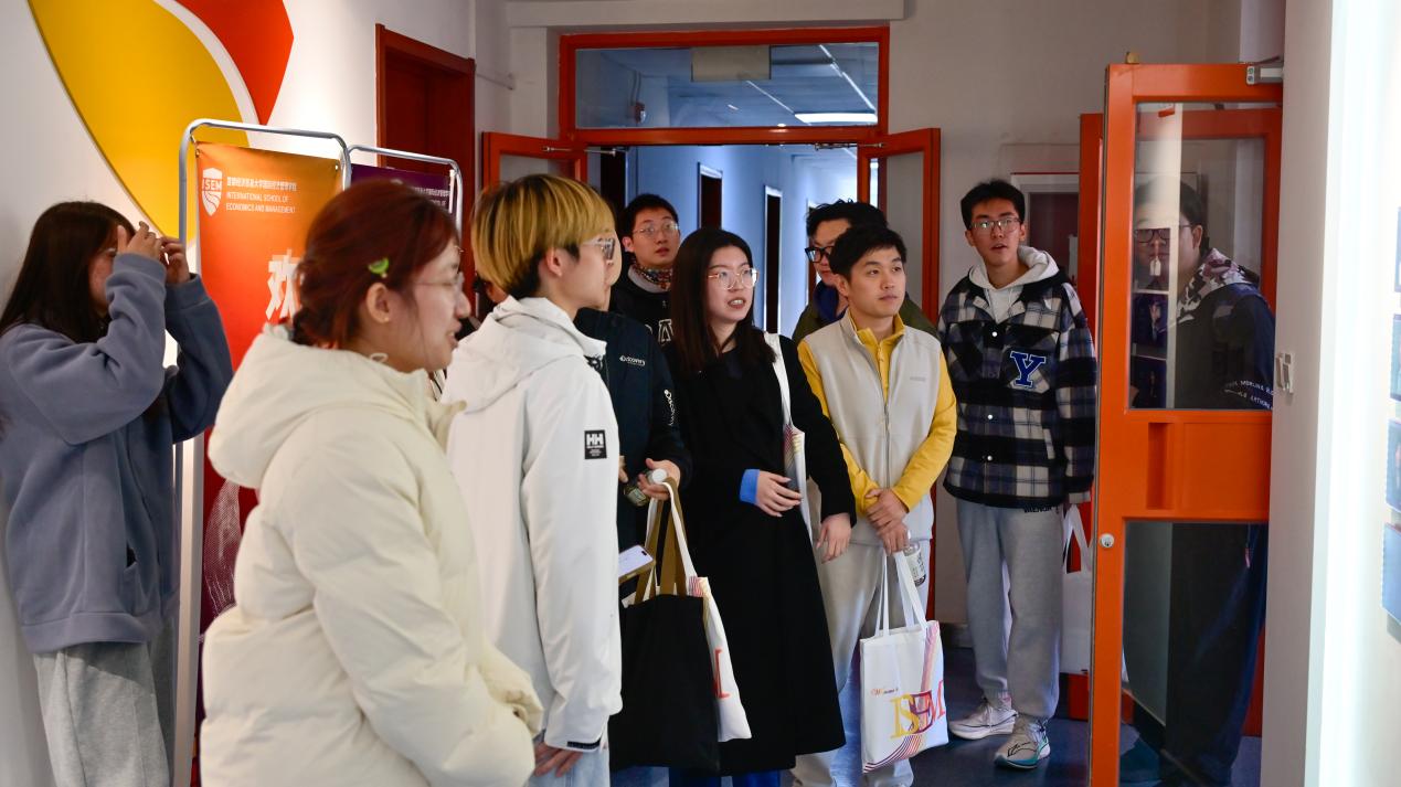 座谈后,志愿者带领校友参观诚明楼三层学院文化墙,细致讲解院徽图标精神理念与“鲸”文化“深潜致远、逐梦远洋”的深刻内涵,让校友们深切感受学院文化传承与发展活力。