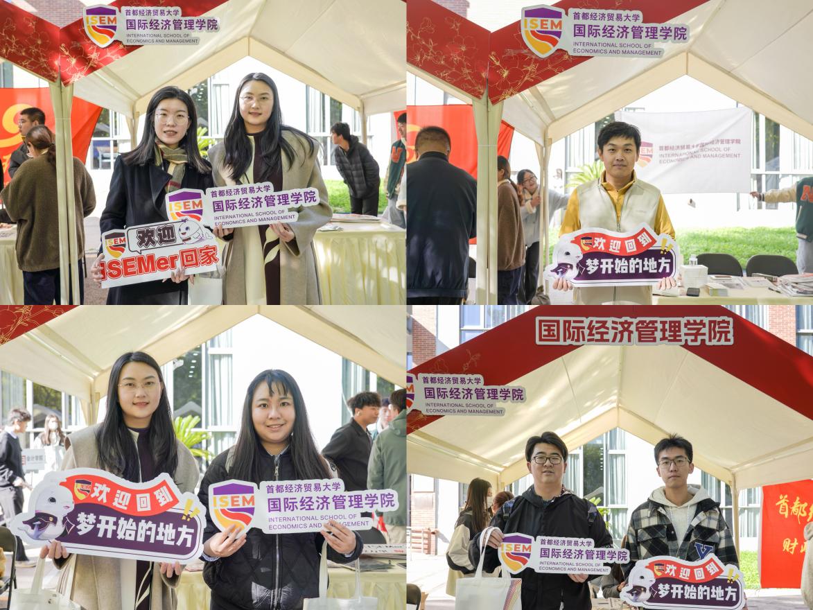 签到仪式在博远楼东侧学院专属摊位举行,这里化作 “影像留痕”打卡点。学院师生与志愿者热情迎接校友,送上精心准备的伴手礼——印有“ISEM”标识的帆布包、定制明信片、文件袋,以及围绕学院IP形象“鲸”设计的便签本与钥匙扣,每一份礼物都承载着学院的温情问候。校友们手持礼物,与熟悉的校园场景合影,定格重逢的温暖瞬间。