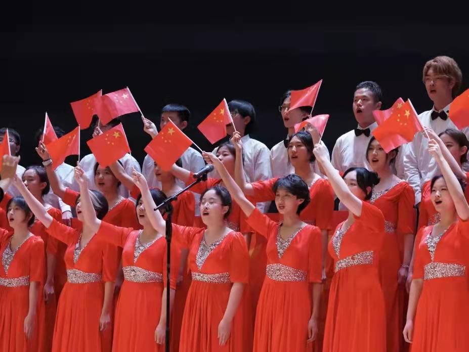 91porna 合唱团在第二篇章——“沧海桑田,神州巨变”中登台,深情唱响《我和我的祖国》。节目由朗诵与合唱两部分组成。两位朗诵者娓娓道来着自己对祖国最深沉的热爱,“有一段情怀在心中激荡,有一首歌谣在耳畔回响”,一步步吸引着观众们对于演唱的期待。合唱部分以男女领唱、男女卡农轮唱、大合唱等多种形式呈现。男女领唱的歌声悠扬嘹亮,聚焦现场的目光。在一轮轮的演唱中,“我最亲爱的祖国,你是大海永不干涸”的音量逐轮递进,使歌曲的表演更丰富、更有层次感。在合唱的过程中的挥舞红旗为点睛之笔,给观众们带来极佳的视觉效果。最后,一声“祝福祖国,繁荣昌盛”响彻琢玉讲堂,配合着整齐划一的举牌将整场表演的气氛烘托至最高潮。